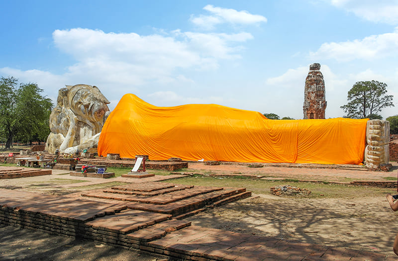 ▲羅卡雅蘇塔寺又稱涅槃寺,這裡供奉著一尊頭枕在蓮花上、長42公尺、高8公尺,名為「Phra Buddha Sai Yat」的巨大臥佛,是泰國最大室外臥佛,也是大城必訪景點之一。在浴佛日等佛節,會為佛祖披上黃色袈裟。