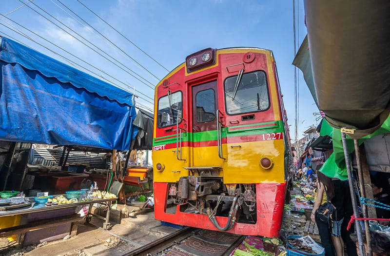 ▲美功鐵道市集(Maeklong Railway Market)是曼谷近郊的傳統市場,遊客可以看到鐵軌兩旁攤擺著傳統市集的特殊景象。每當火車駛過時,攤販們會從容地將原本擺放在鐵軌上的蔬菜、生魚和新鮮肉類收起來。遊客可以目睹火車底盤穿梭過生鮮商品後,市場恢復平靜,就像火車從前沒有經過一樣。這真是一個十分特別的奇觀!